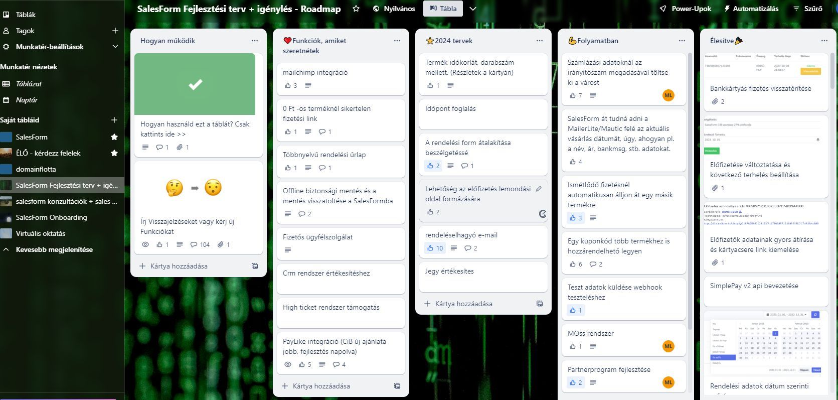 Ebben a trello táblában gyűjtjük a fejlesztési igényeket és az élesített fejlesztéseket